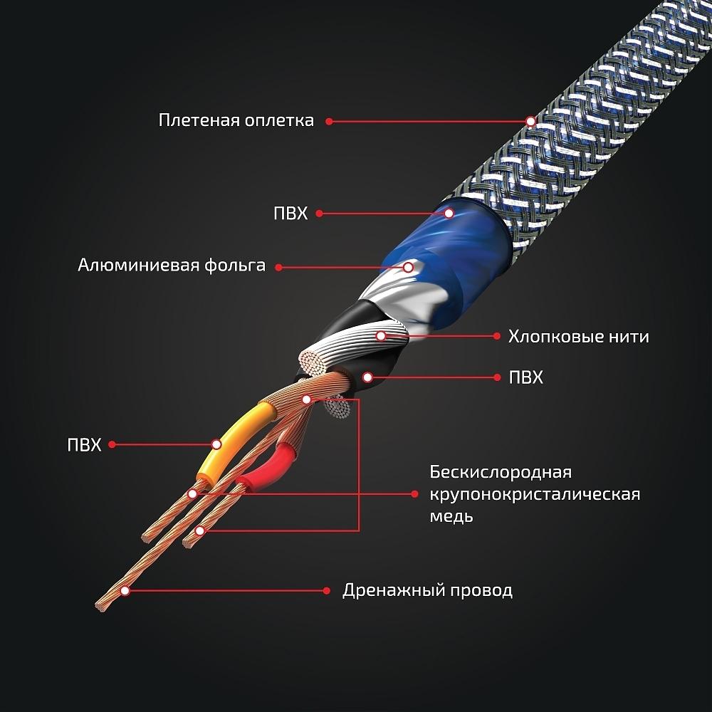 Профессиональный межблочный 2-х канальный кабель с проводником из чистой бескислородной меди защищенной тройной модифицированной изоляцией позволяет без потерь передавать сигнал от источника к усилителю. Кабель имеет направленую схему построения, что необходимо учесть во время проектирования и инсталляции. Подключение дренажного провода к массе автомобиля, дополнительно экранирует кабель и защищает сигнал от воздействия электромагнитных волн возникающих в бортовой сети автомобиля. Надежный контакт обеспечивается стальными коннекторами с высокопроводным никелированным покрытием. Полиэстеровая оплетка (змея) дополнительно защищает от механических воздействий.