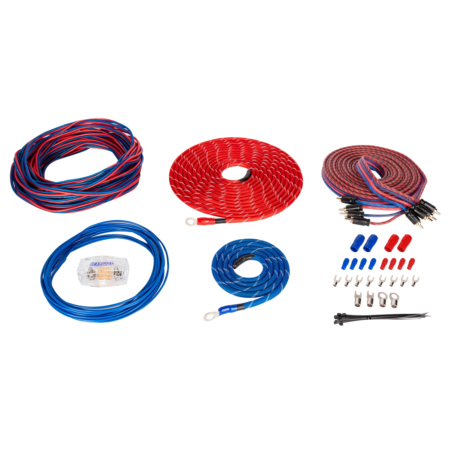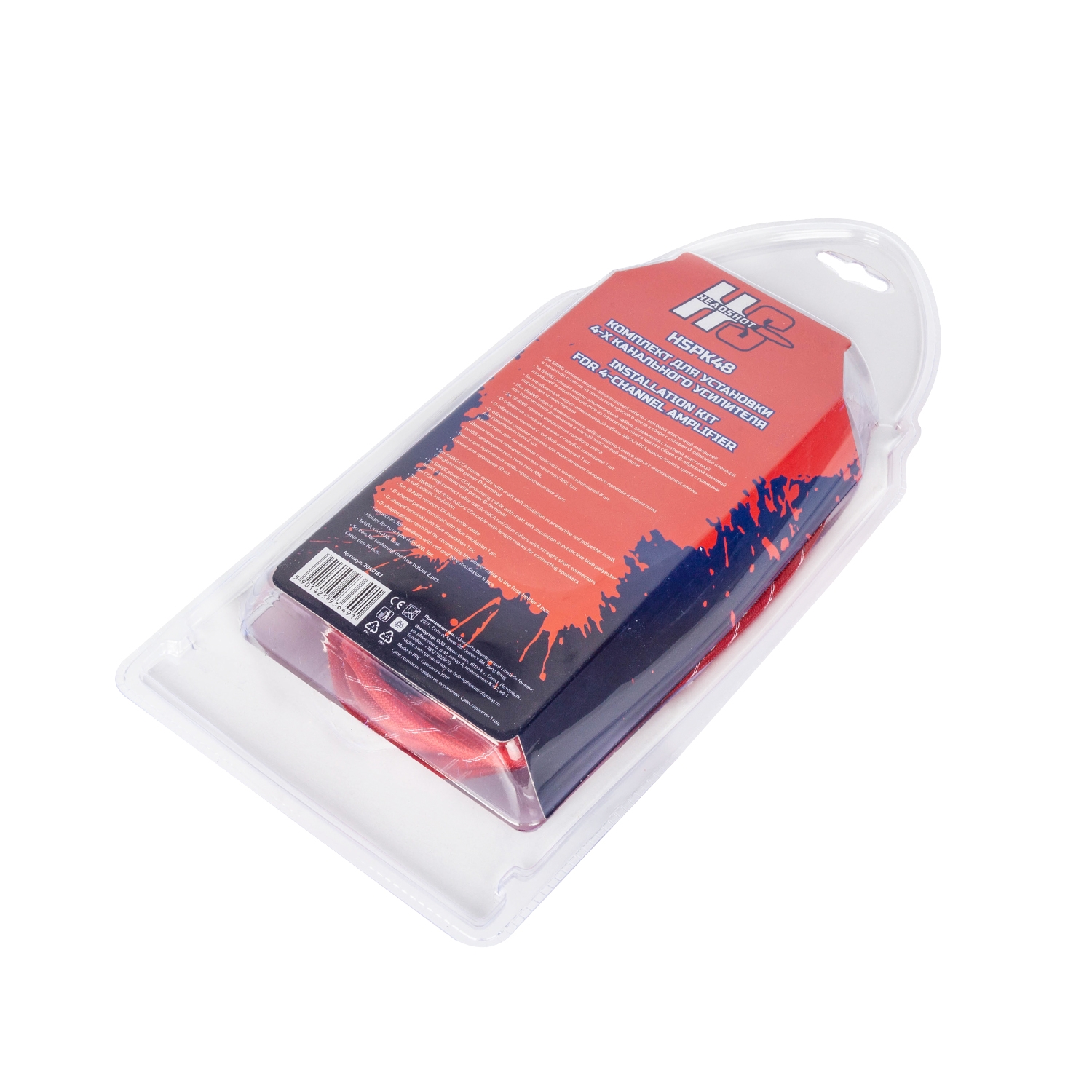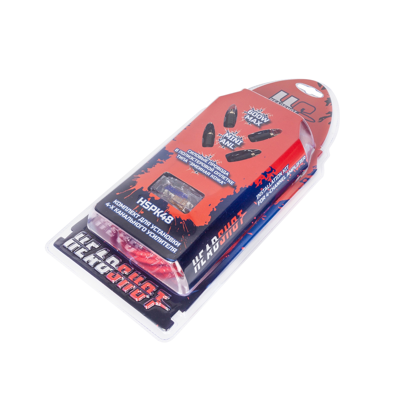 Установочный комплект повышенной надёжности для 4-х канального усилителя средней и высокой мощности HEADSHOT HSPK48 с силовым кабелем сечением 8AWG, акустическим кабелем 16AWG и предохранителем 40А Mini ANL